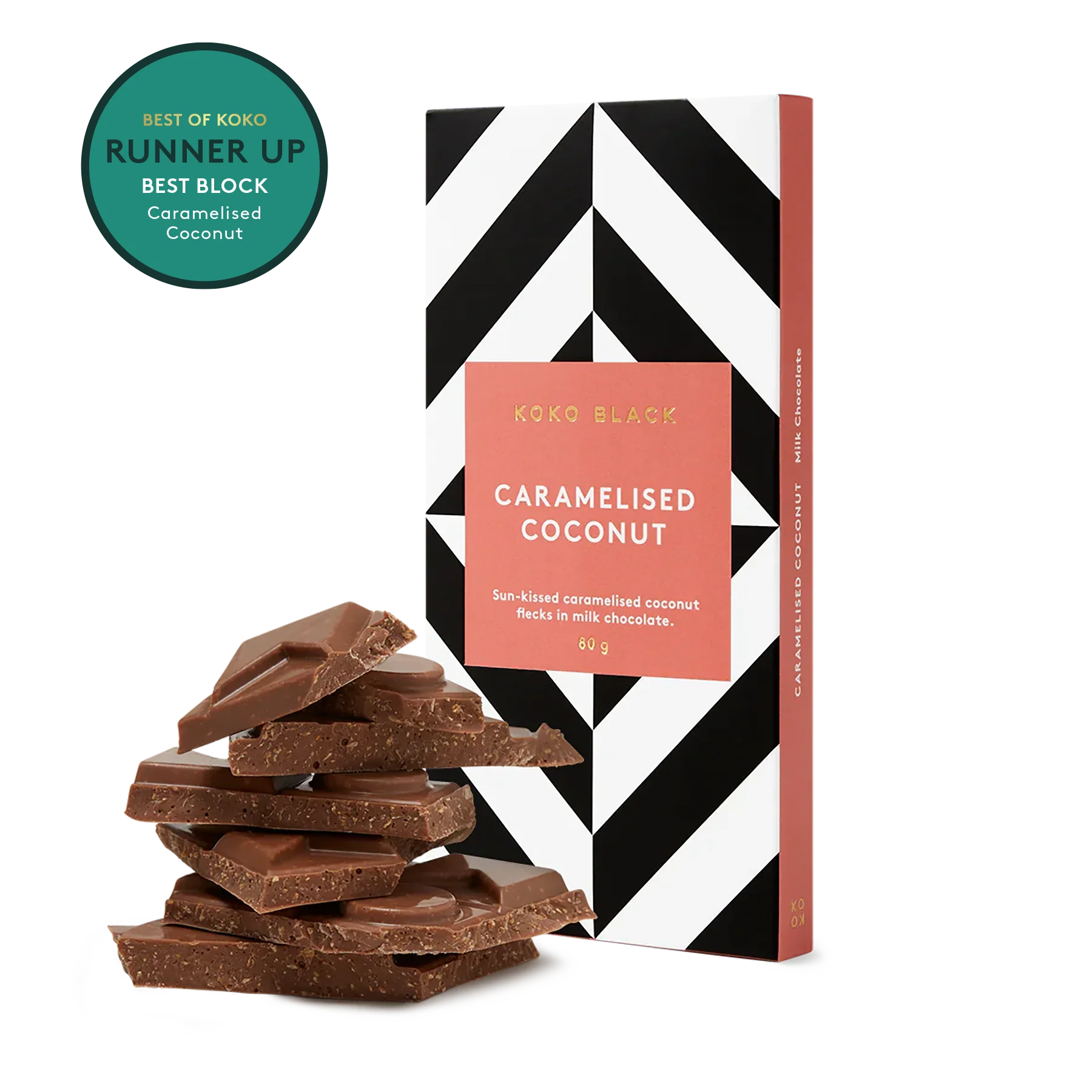 Sun-kissed caramelised coconut flecks in milk chocolate.