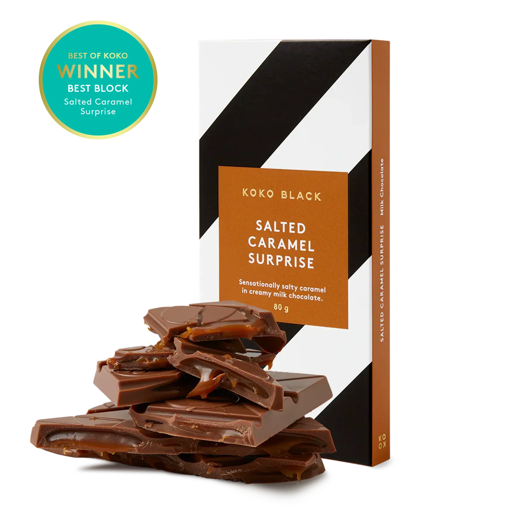 Sensationally salty caramel in creamy milk chocolate.